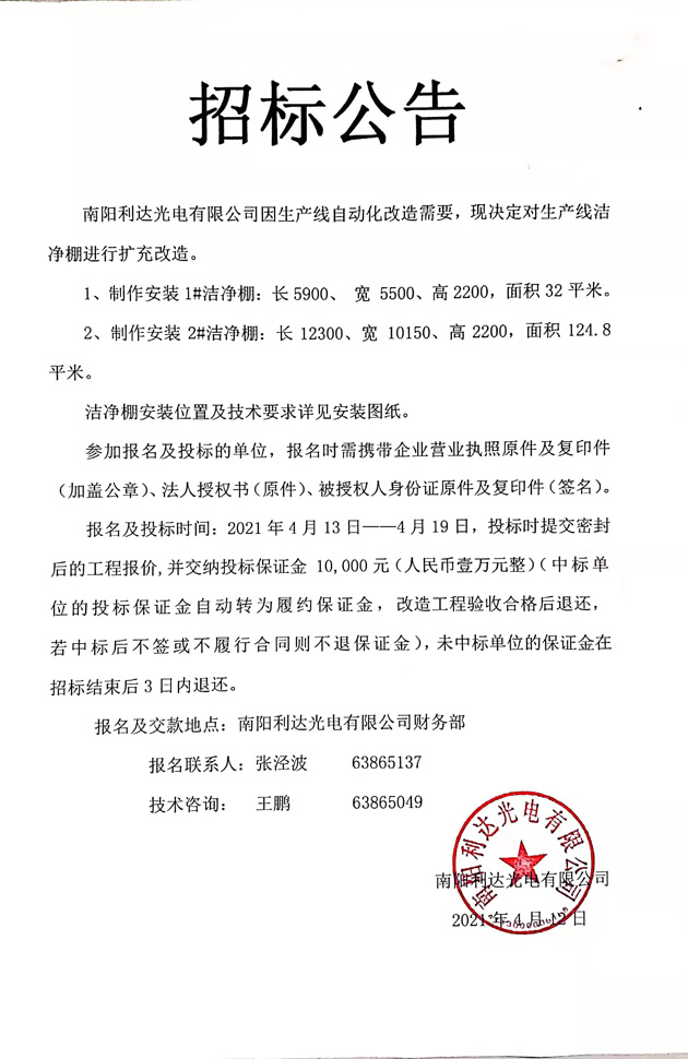 生產(chǎn)線潔凈棚擴(kuò)充改造招標(biāo)公告